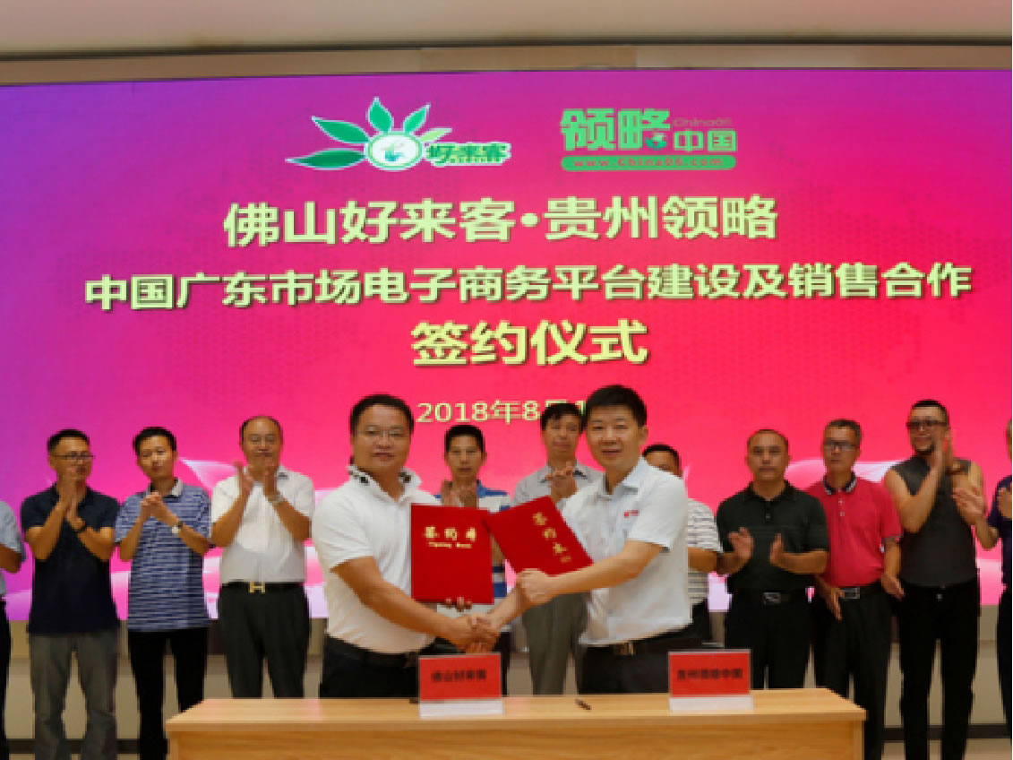 佛山市好来客食品有限公司董事长杨海滨与贵州领略农产品大数据有限公司董事长黄亚欣代表双方正式签署这个交易金额1.44亿元人民币,面向贫困户、农户种植2万吨生态大米的定向采购合同。